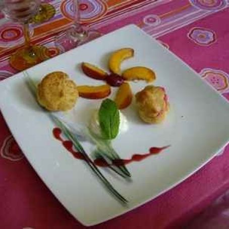 Garnish the choux pastry, onced cooked and cooled enough to cut open, with mango and red fruits ice-cream. Add a dollop of whipped cream on the plates and place a few mint leaves on top. Drop small "spots" of warm raspberry jam to decorate and join them together by dragging a spoon through each drop!