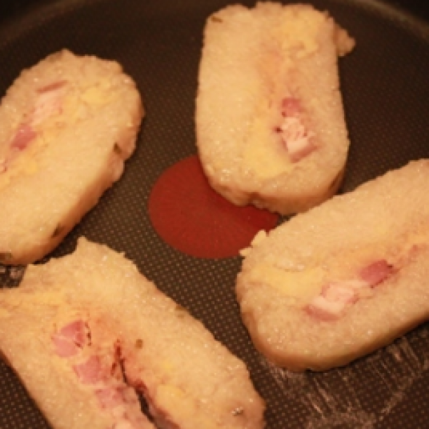Remove the string, the film and the banana leaf. Cut the parcels into slices and fry on both sides in a little oil.
