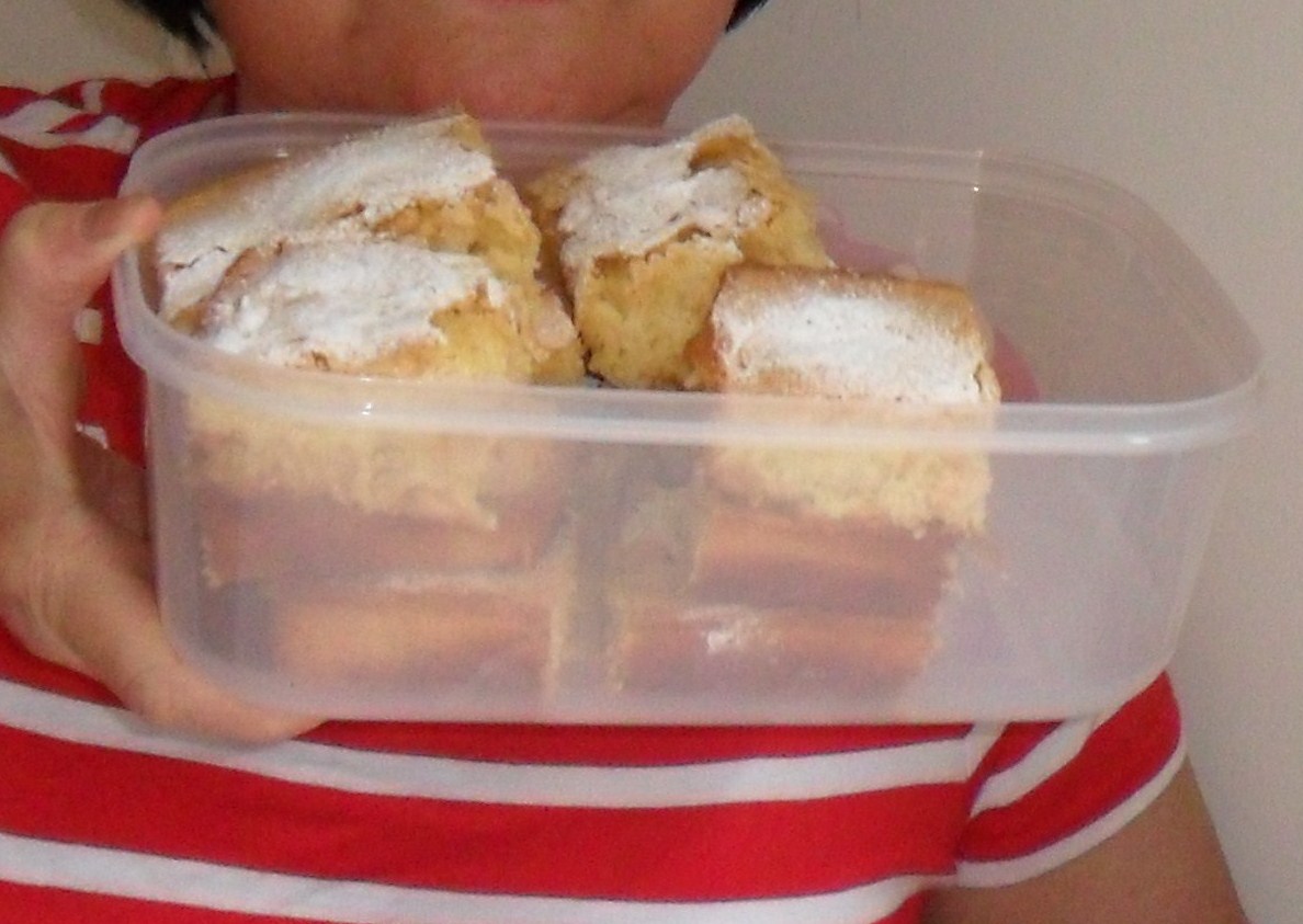 Remove from the oven Leave to cool. Dust with icing sugar. Cut into small squares. Store in an air tight tin.