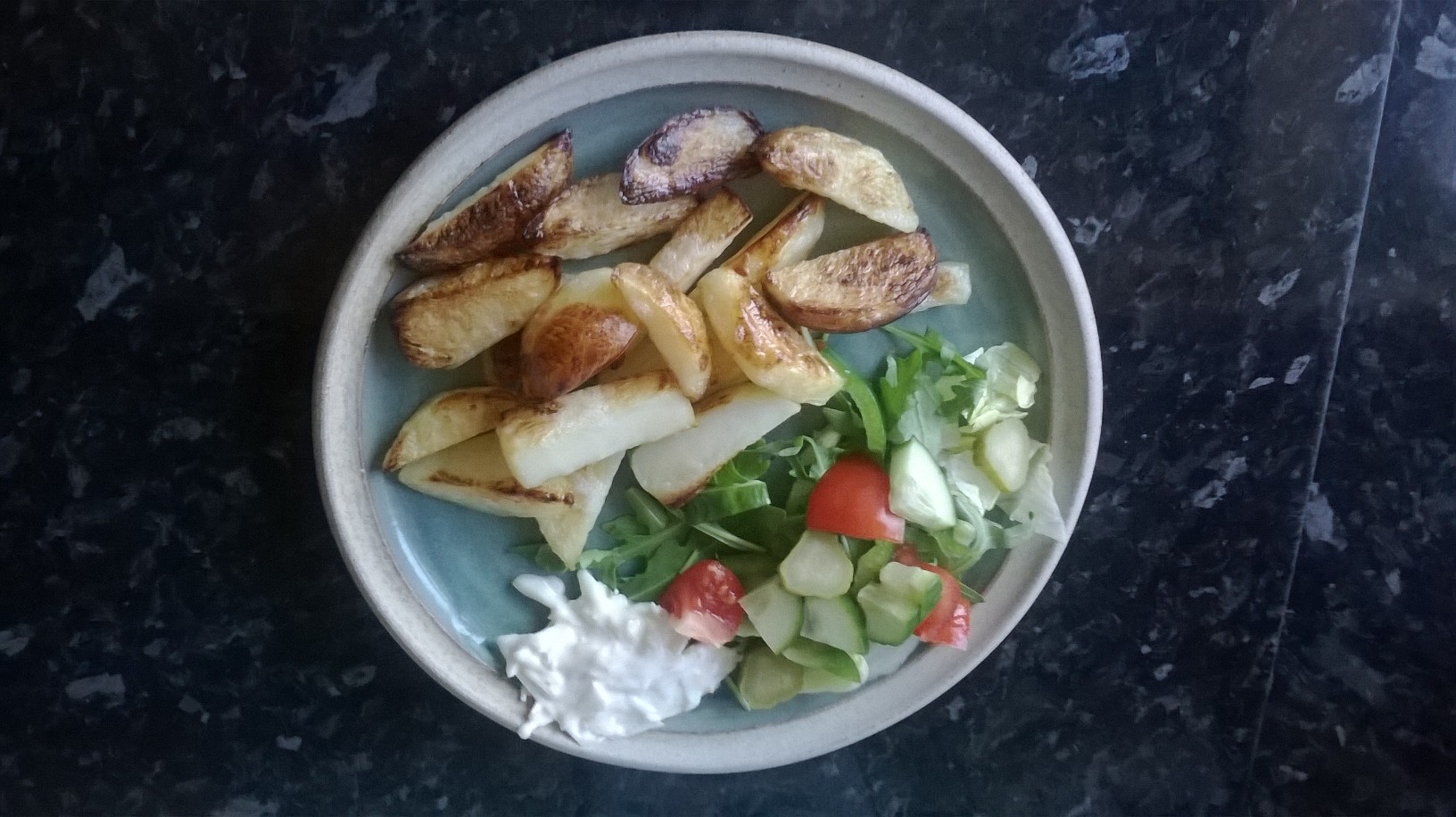 Spray a baking tray with spray oil add the potatoes and spray again. Cook until golden brown. (This will usually take about 35 minutes depending on the size of the chips).